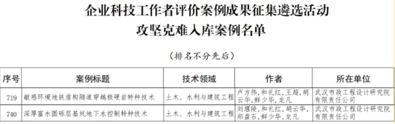 ? ? ?2025年6月4日,中國科協(xié)發(fā)布了《關(guān)于企業(yè)科技工作者評價案例成果征集遴選活動結(jié)果的通知》,公布了《企業(yè)科技工作者評價案例庫》,其中攻堅克難案例843項、成果轉(zhuǎn)化案例726項。武漢市政院巖土博士創(chuàng)新工作室申報的“敏感環(huán)境地鐵盾構(gòu)隧道穿越極硬巖特種技術(shù)”、“深厚富水圓礫層基坑地下水控制特種技術(shù)”兩項攻堅克難案例與技術(shù)均成功入庫。