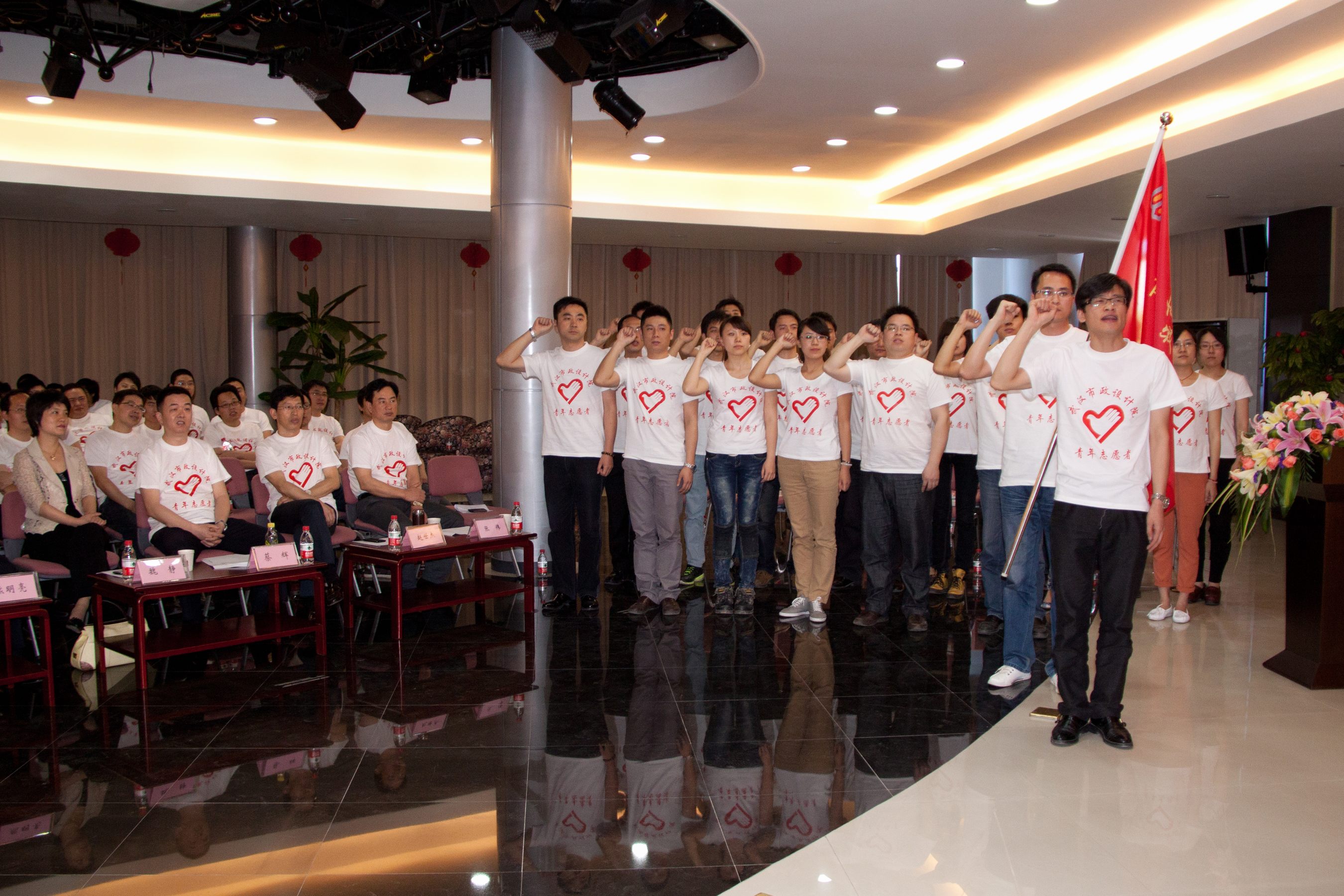 ??? 青年員工代表周鼎手持青年志愿者的旗幟走入會(huì)場(chǎng),公司青年志愿者先鋒隊(duì)成立儀式正式開始。市城建委副主任熊明亮同志接過旗幟,并親手將其交給青年志愿者先鋒隊(duì)隊(duì)長(zhǎng)李威。20名青年志愿者代表走到會(huì)場(chǎng)前排莊嚴(yán)宣誓。隨后,公司團(tuán)總支書記張茂會(huì)鄭重宣布:公司青年志愿者先鋒隊(duì)成立。