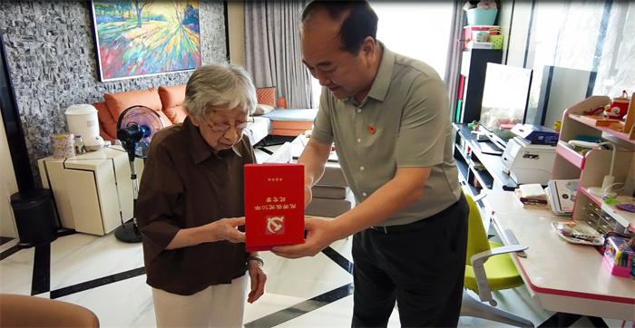 公司黨委書記、董事長武興治來到離休老黨員陶潛的家中,為她佩戴“光榮在黨50年”紀念章,并送上慰問金。武興治親切詢問了陶老的身體和生活狀況,感謝她為公司發(fā)展做出的突出貢獻,叮囑她保重身體,尤其要注意防暑降溫,并祝愿她健康長壽。