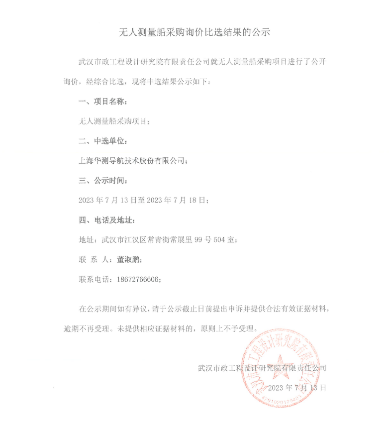 無人測量船采購詢價(jià)比選結(jié)果的公示