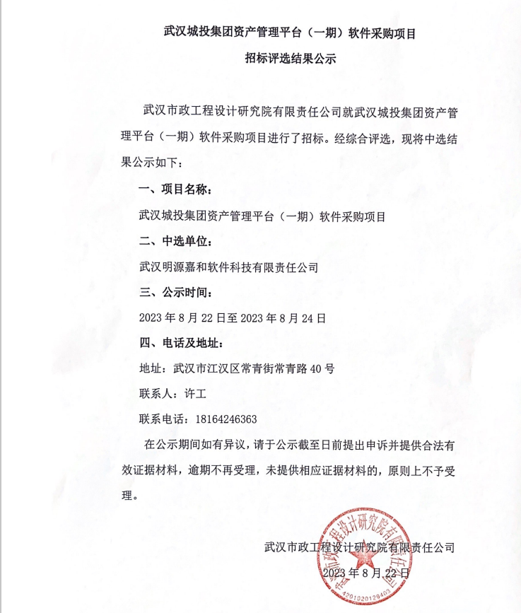 武漢城投集團資產(chǎn)管理平臺(一期)軟件采購項目招標(biāo)評選結(jié)果公示